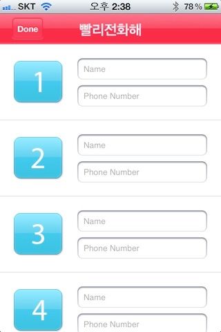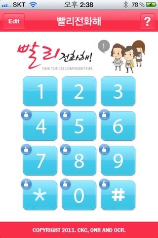 2011년에 스마트폰이 대세가 되려고 꿈틀되던 무렵, 스마트폰에 아직 적응이 덜 끝난 어르신들을 위한답시고 개발한 앱이다. 그당시에는 단축 번호에 자주연락하는 지인들의 전화번호를 등록하여 전화를 쉽게 걸 수 있도록 돕는 기능이 있었다. 예를 들면, 숫자패드1을 길게 누르면 해당 1번에 저장되어 있는 전화번호로 전화를 걸어줬다.