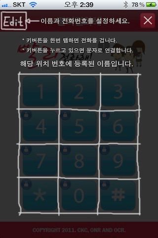 사용법은 단순하게 했다. 앱을 실행한 후, 번호를 클릭하면 저장되어있는 전화번호에 전화를 걸고 , 번호를 길게 누르면 문자를 보낼수 있는 창을 호출해서 문자를 보낼수 있었다. 안드로이드 아이폰 용으로 모두 개발되었고, 무료로 다운로드 받을수 있었다.