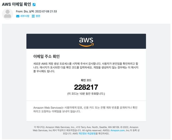 확인코드를 입력하라는 화면이 뜨고, 이메일로 아래와 같은 메일이 전송된다.