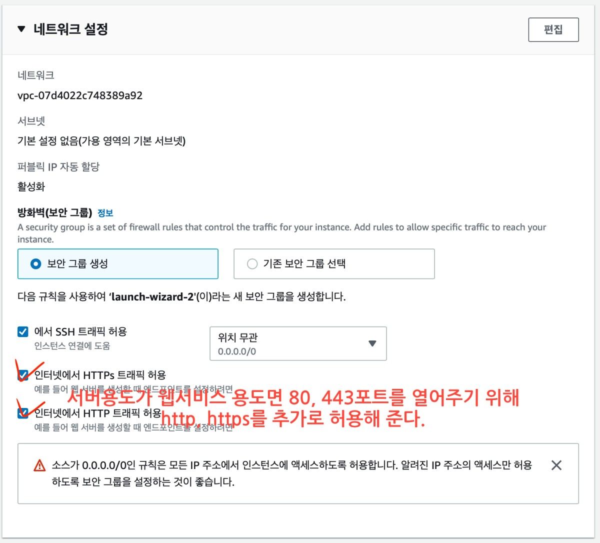 네트워크 부분 설정도 일단 웹서비스를 한다는 가정하에 http, https 트래픽 허용으로 체크한다.