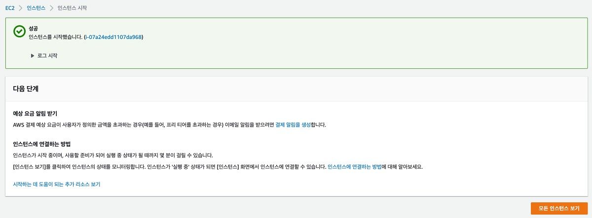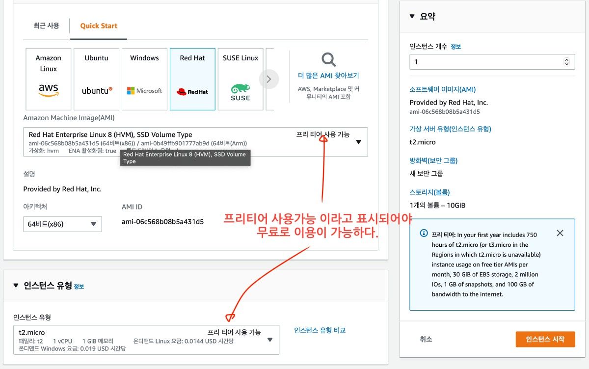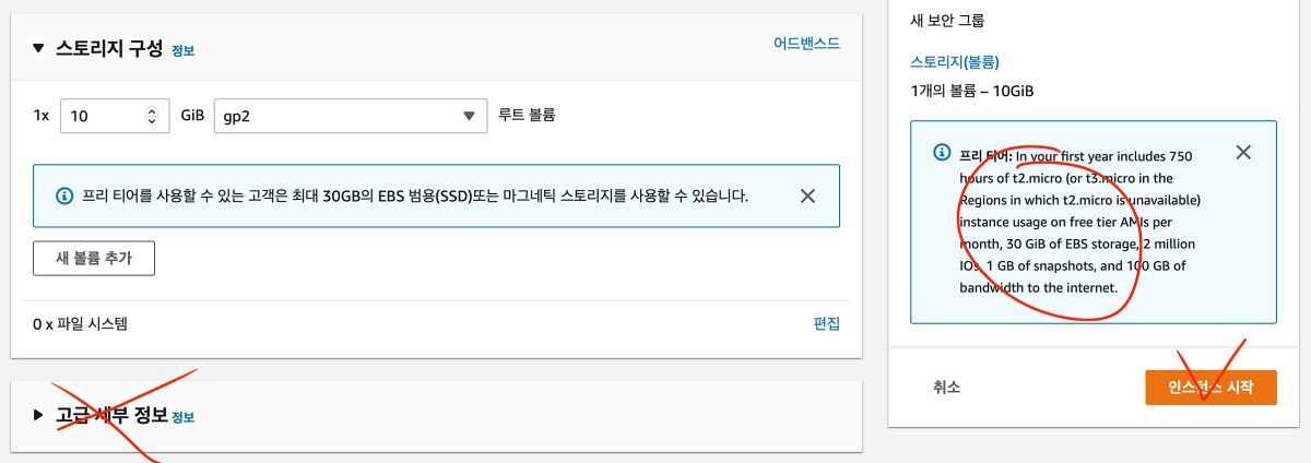고급설정을 열면 깜짝놀라니 열지도 말고, 프리티어 조건을 확인하고 인스턴스 시작을 클릭한다.