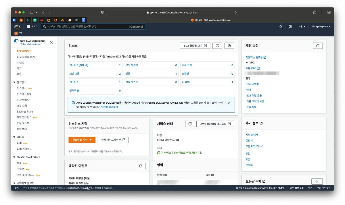 현재 내 대시보드를 보면 인스턴스 1개가 구동되고 있는 것을 볼 수 있다.