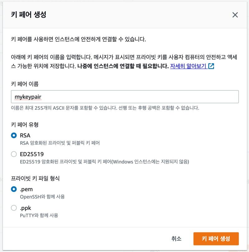 키페어 이름을 입력한다. 나는 mykeypair 이라고 입력했다. 자기가 편한 이름으로 입력하면 된다. 나는 맥이기 떄문에 .pem 을 선택했지만, 윈도우 환경이라면 .ppk로 설정해서 생성하면 된다. 그러면 Putty에서 사용이 가능하다.