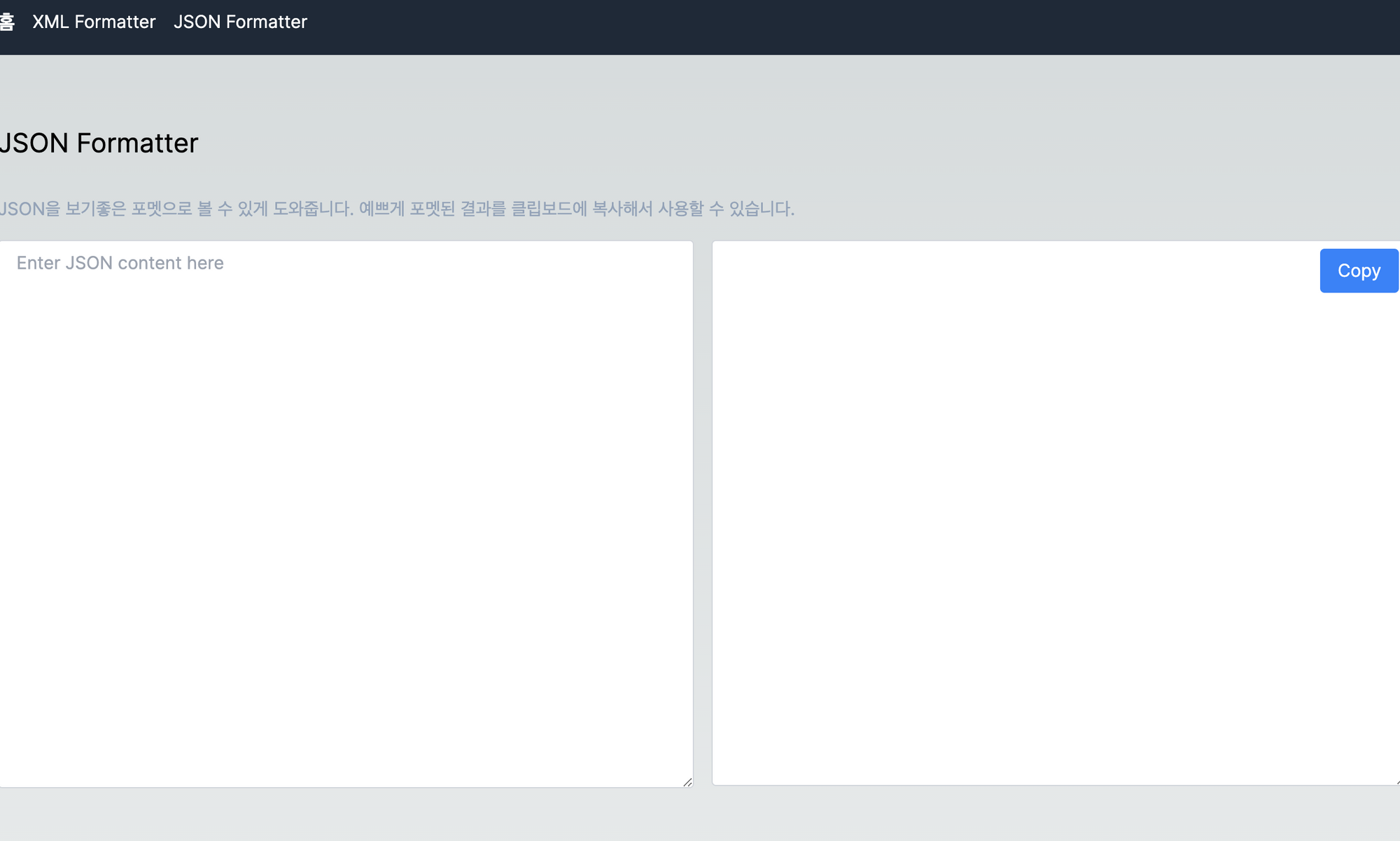 정확히는 XML과 JSON을 간단히 보기좋게 만들어주는 프로그램이 필요했다. 매번 외국사이트를 뒤지는 것도 귀찮고, 회사에서 사용하는 데이터들을 외국사이트에 올려서 보기좋게 만드는 것도 불안했다. 물론 IDE에 플러그인을 깔아서 보거나, 기본적으로 지원하는 에디터나 IDE도 있겠지만 그냥 웹이 제일 편하다. 그래서 나 편하자고 만들었다.