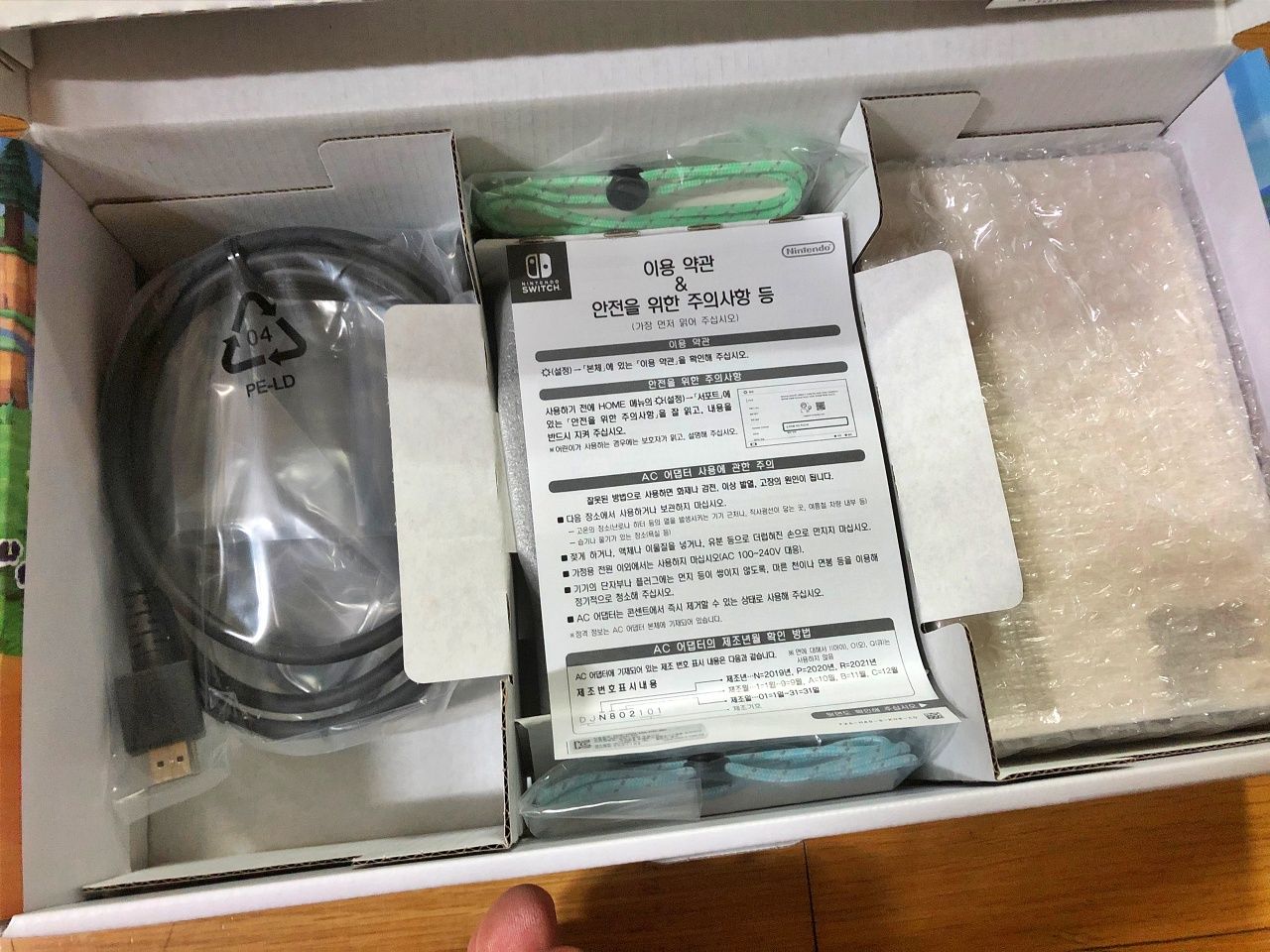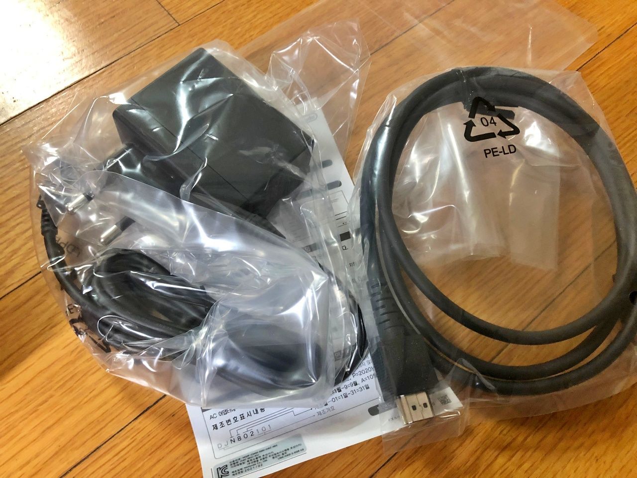 왼편에 충전기와 흐드미(HDMI)케이블이 있다.