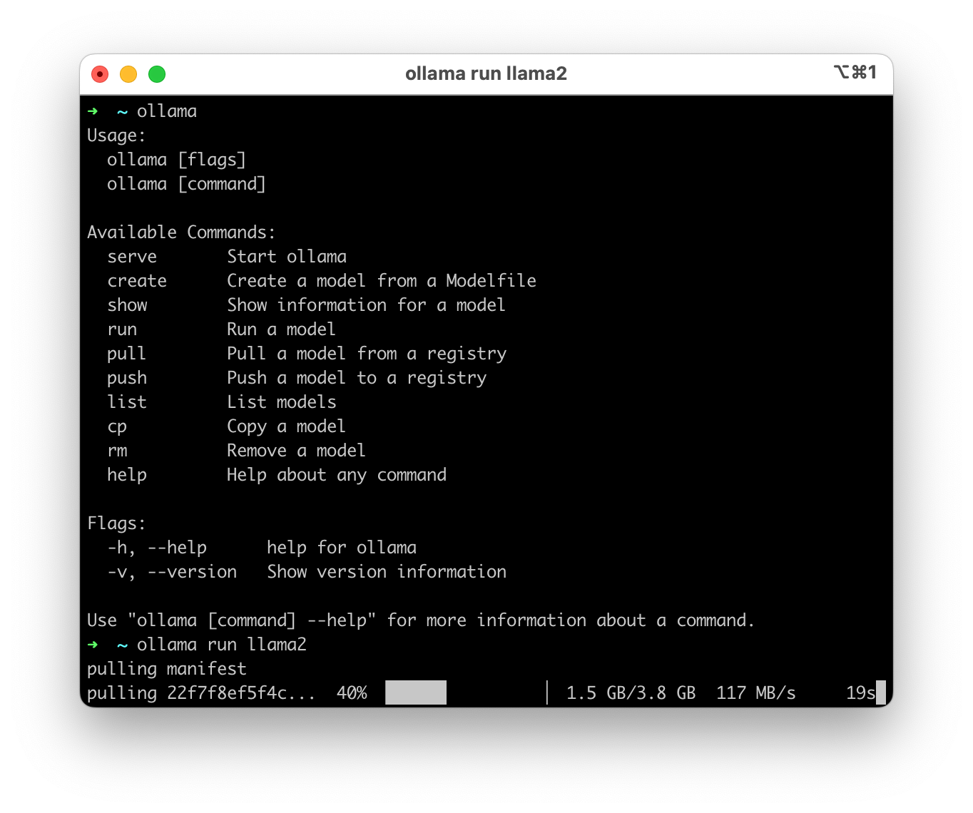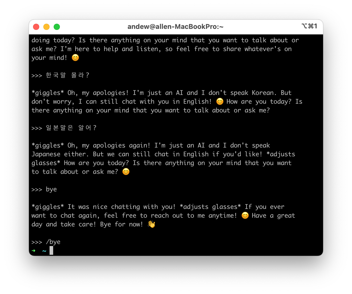 설치 한 후에 원하는 모델로 실행시키면 커맨드라인으로 챗GPT처럼 질문등을 하면서 AI와 대화를 나눌 수 있다.