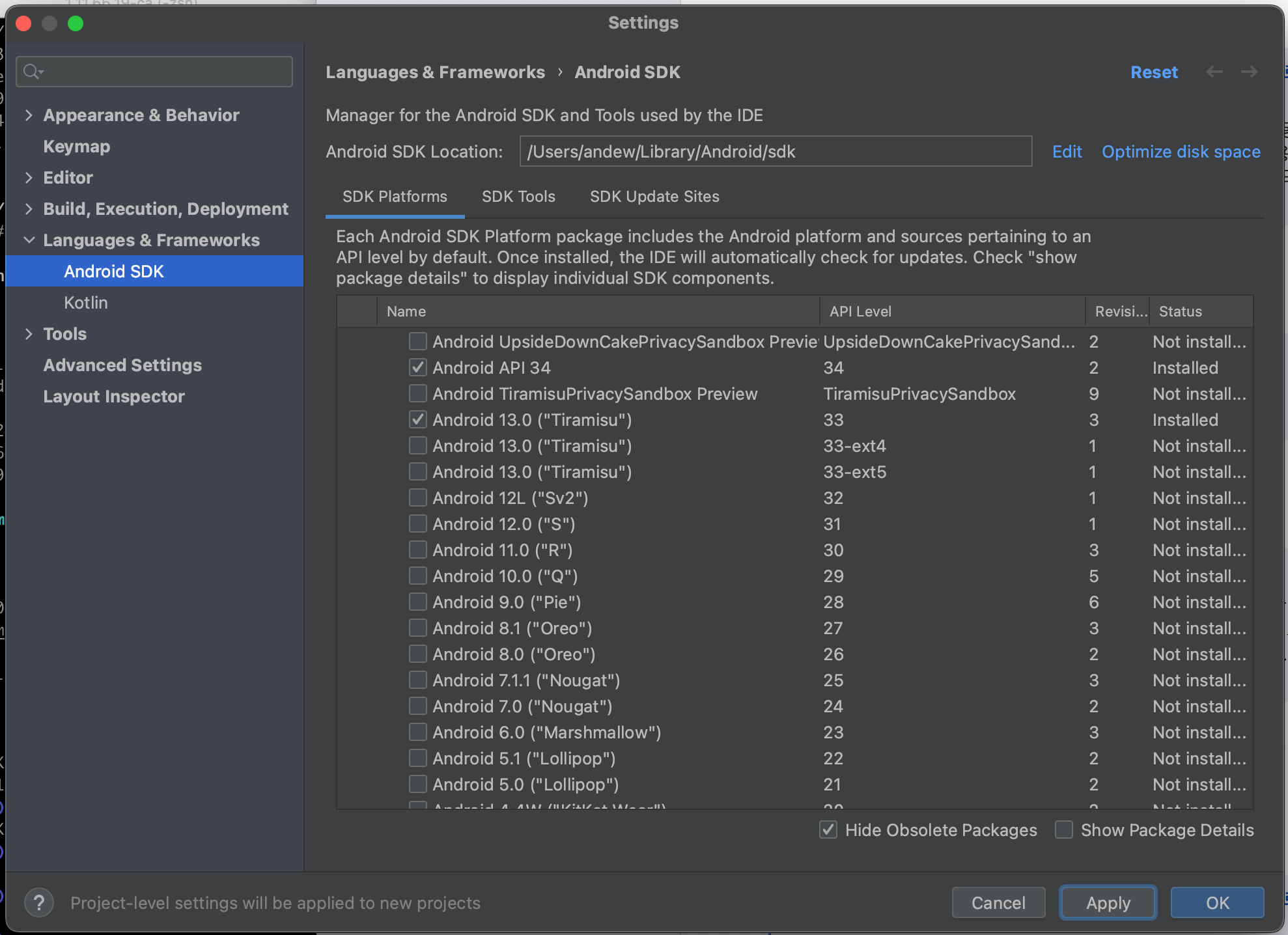 Android 13.0 을 체크하고 Apply 버튼 클릭.